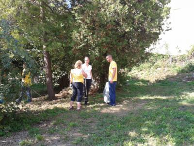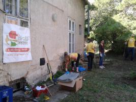 A kertben véget nem érő gereblyézés, cserjemetszés indult, komposztálóhelyet is kijelöltünk, hogy a sok zöldhulladék később ismét felhasználható földdé váljon. Ahogy tanultuk, apróra vágtuk a gallyakat, és kevertük a fűkaszálékot és leveleket, hogy biztos legyen a siker! Kikapáltunk pár nem odaillő növényt, hogy tavasszal újakat lehessen ültetni helyükre. A felső - vélhetően sittel töltött - támfalat, közös ötletre megpróbáltuk eltakarni a kivágott növényekkel. Az épület oldalában megjelent gazt kicsipkedtük. Sőt, a végén olyan gyorsan elkészültünk, hogy akiben maradt még erő, egy fatönköt is kicsákányozott. A vashulladékot odaadtuk a helyi erőknek, hogy ők hasznosíthassák.