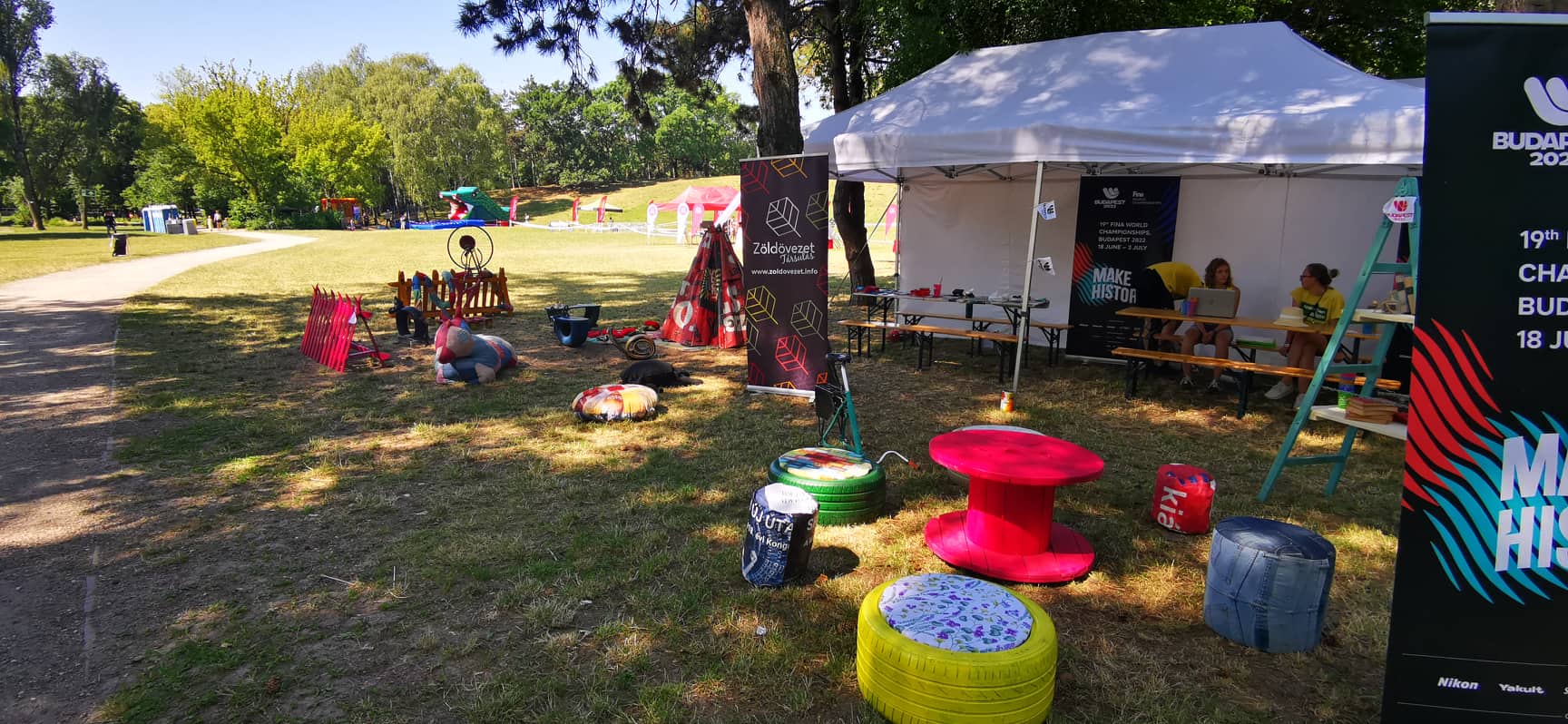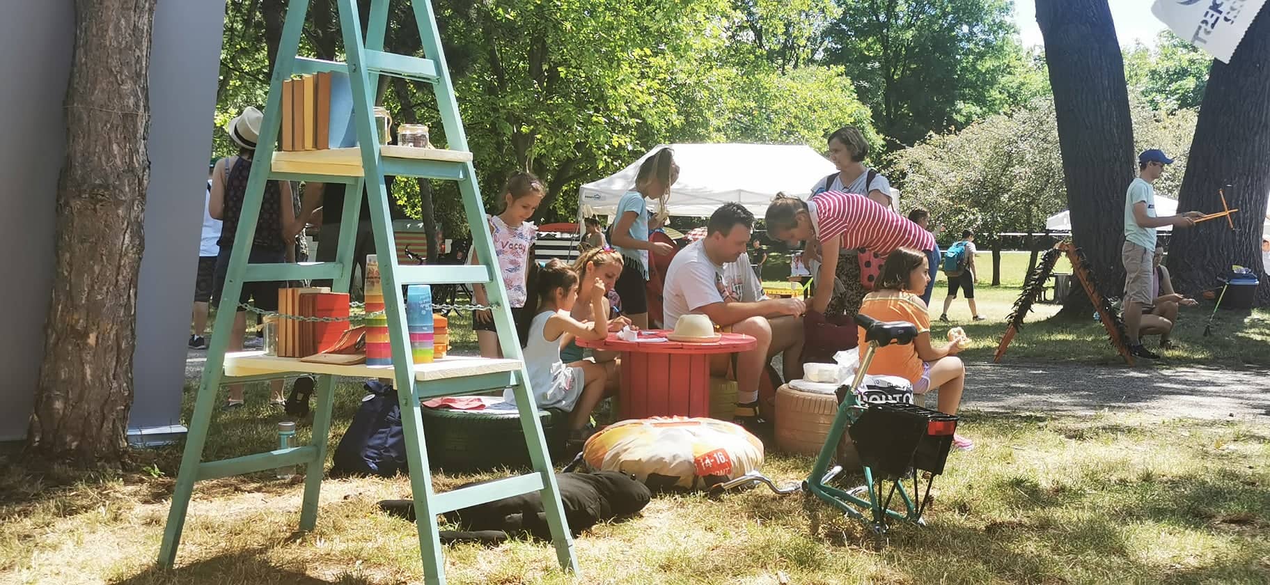 A legkisebbek a RePlacc játszóházunkban játszhattak az újrahasznált-újragondolt tárgyakból készült játékokkal, a nagyobbak pedig maradék anyagból, nevezetesen lepedőből készíthettek zászlót, amit aztán magukkal is vihettek. A felnőttekre is gondoltunk, a hulladékból létrehozott chillpontunkon lehetőségük volt egy kis pihenésre. Puffokat, asztalokat, könyvespolcot alkottunk meg hulladékból, ami nem csak hasznos, praktikus, de a visszajelzések alapján kényelmes is volt. A felnőtteknek lehetőségük volt a könyvespolcon található könyveket örökbefogadni.
