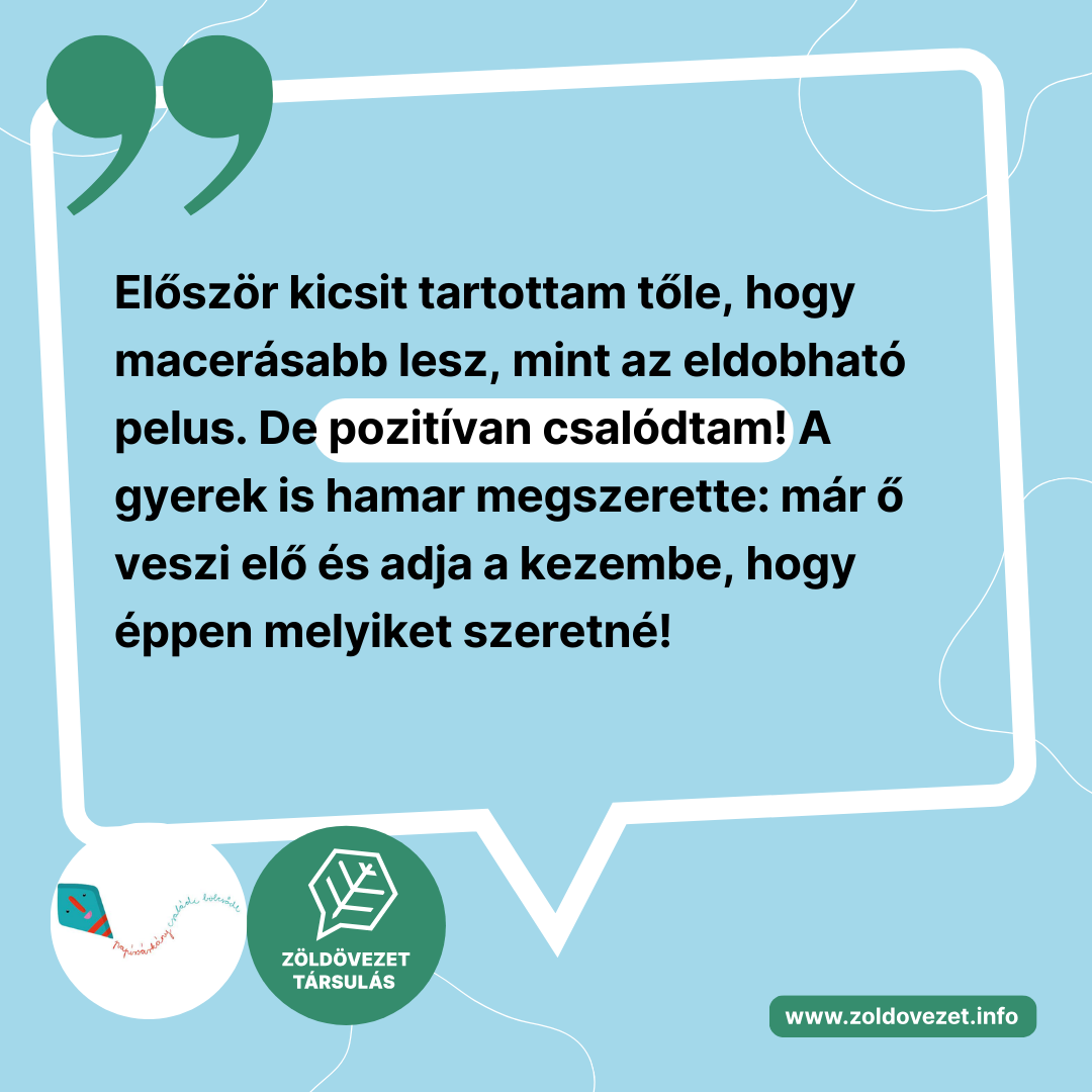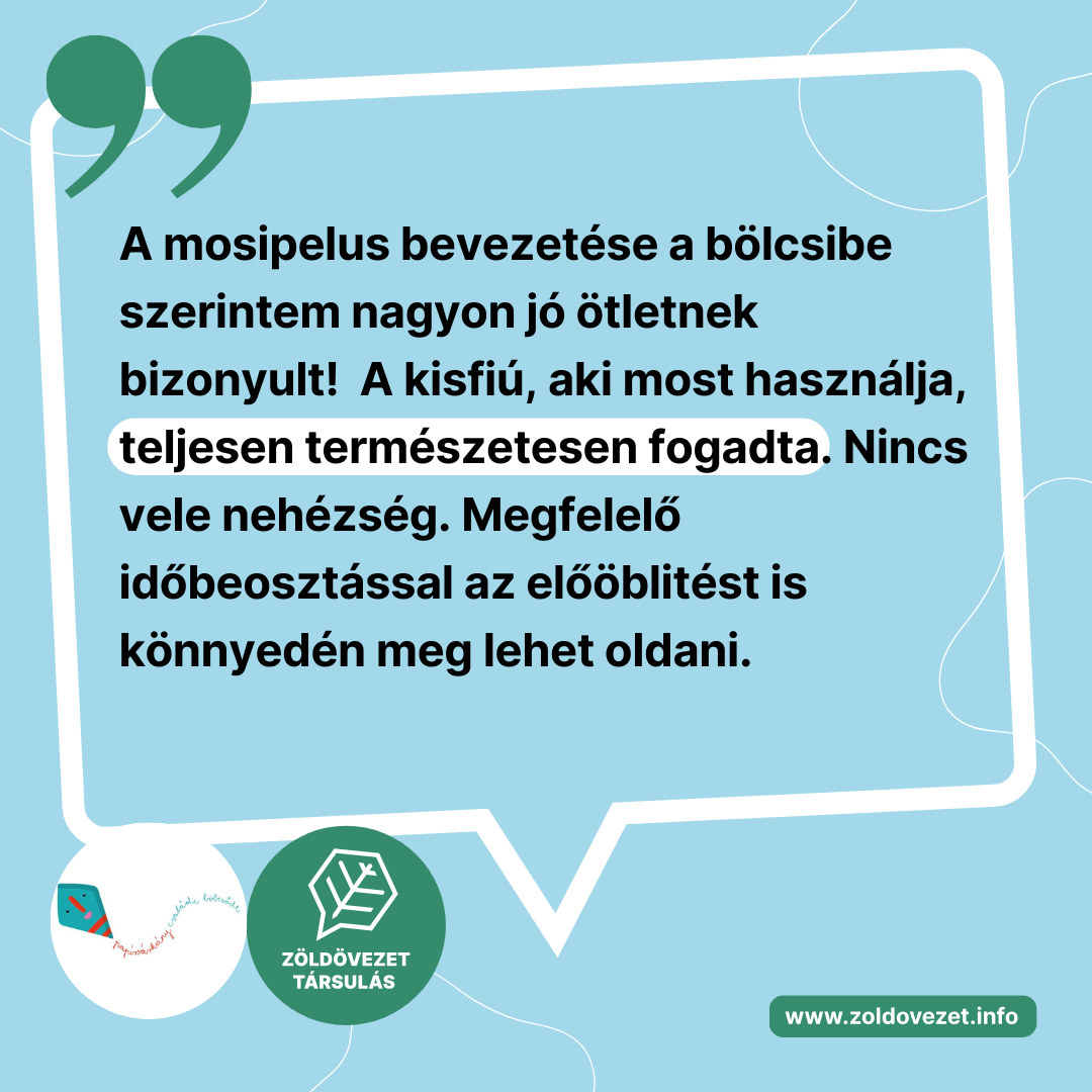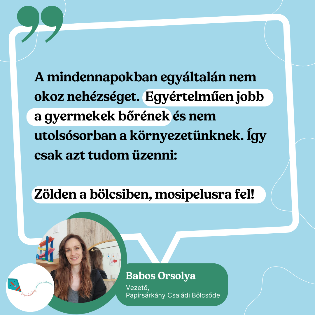 Az pedig, hogy mennyivel jobb a gyermekek bőrének és nem utolsósorban a környezetünknek, talán nem is kell magyarázni! Így csak azt tudom üzenni: Zölden a bölcsiben, mosipelusra fel!