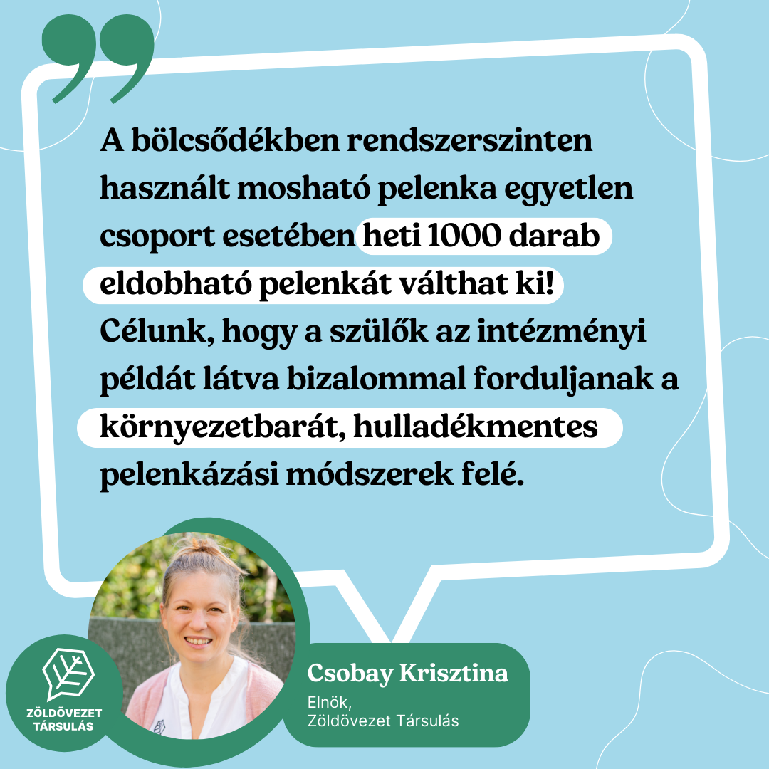 Azok a családok, akik mosható pelenkát használnak, a bölcsődei környezetben is ezt szeretnék látni gyermekükön. Magyarországon azonban sok intézmény dolgozója még nem ismeri a mosható pelenkát, ezért gyakran idegenkednek tőle, pedig egyáltalán nem bonyolult. A mostani kezdeményezés célja az volt, hogy bemutassuk: egy bölcsőde rendszerszinten is képes hatékonyan alkalmazni a mosható pelenkákat. Így olcsón csökkenthető az eldobható pelenkák okozta hulladék mennyisége – például egyetlen csoport esetében akár heti 1000 darab eldobható pelenkát vált ki. Összehasonlításképpen: egy gyermek születésétől szobatisztaságig átlagosan 6000 eldobható pelenkát használ, ezért a heti 1000 darab hulladék megtakarítása óriási lépés a fenntarthatóság felé.